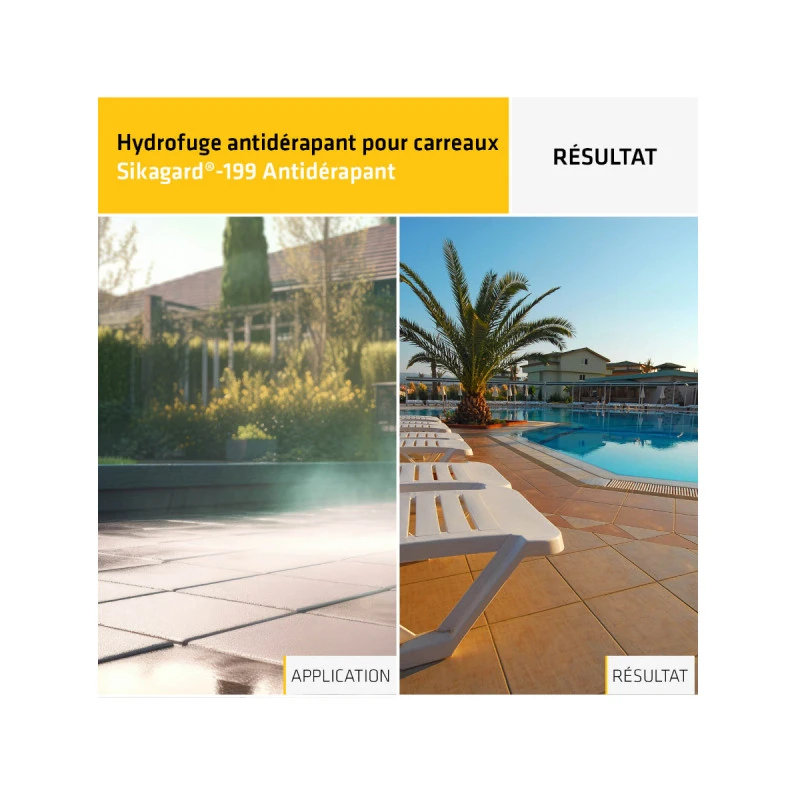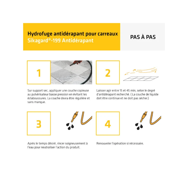 Ce anti-dérapant Sikagard-199 est un traitement minéral antidérapant pour les carreaux céramique lisses. Il octroie aux surfaces un gommage surfacique et irréversible de la vitrification des revêtements céramiques, réduisant très fortement la glissance à l’état humide. Ce produit s’applique en intérieur comme en extérieur sur toutes les surfaces lisses et minérales (Carrelage, grès cérame, email, faïence, pierre naturelle, marbre…) Il est donc idéal pour traiter tous les abords rendus glissants en présence d’eau : terrasses, marches d’escaliers, rampes d’accès piétonnier, halls d’entrées, complexes sportifs, plages de piscines, cuisines, bacs à douche, baignoires… Il ne doit cependant pas être utilisé sur les supports traités avec de l’huile de lin ou avec une protection hydrofuge, les bacs acrylique ou autres résines, les peintures, vernis, le PVC, les sols souples, le bois, l’ardoise naturelle, le béton ciré, béton quartz…